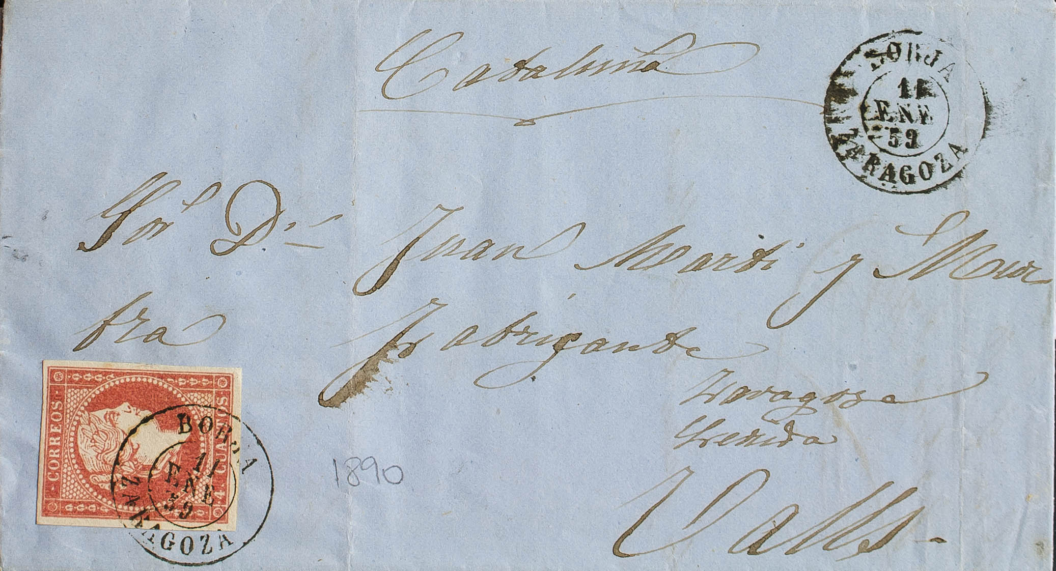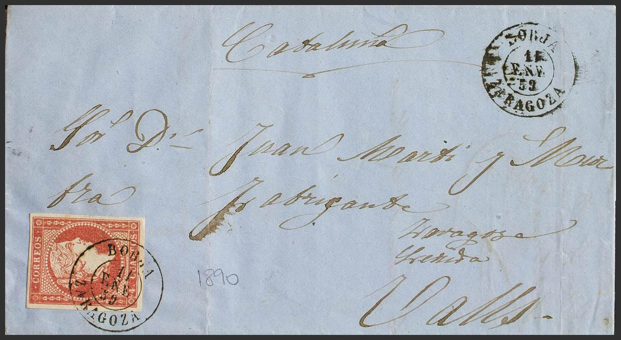 48. 1859. 4 cuartos rojo. BORJA a VALLS. Matasello BORJA / ZARAGOZA. MAGNIFICA Y MUY RARA.