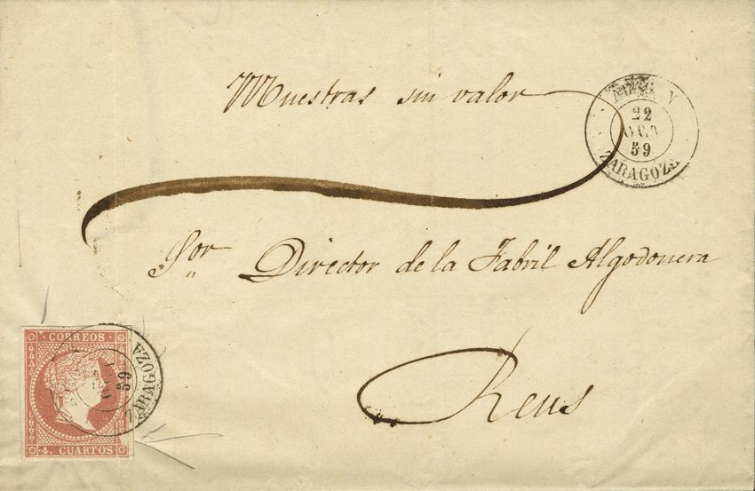 48. 1856. 4 cuartos rojo. ALAGON a REUS. Matasello ALAGON / ZARAGOZA.