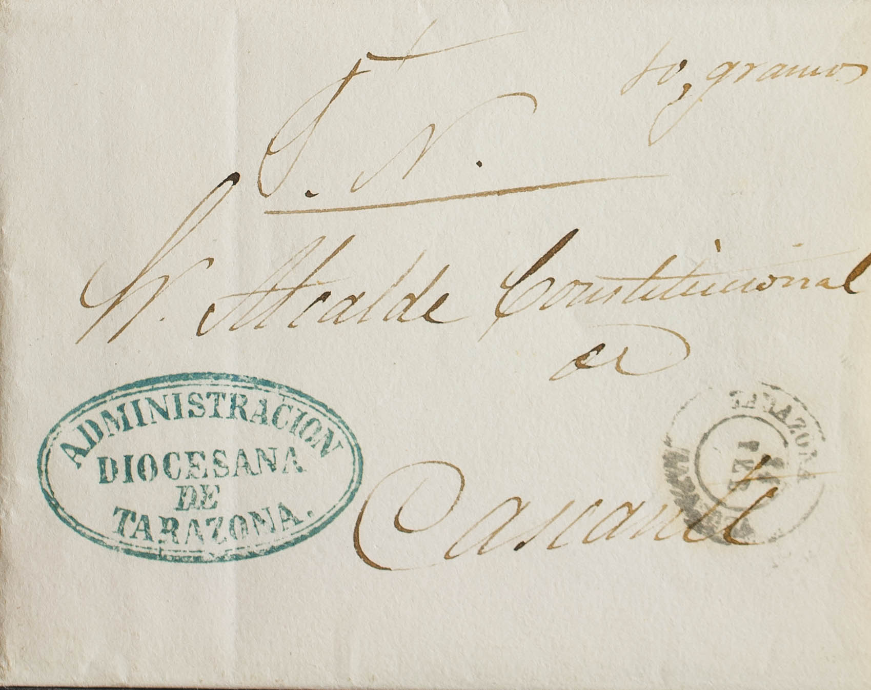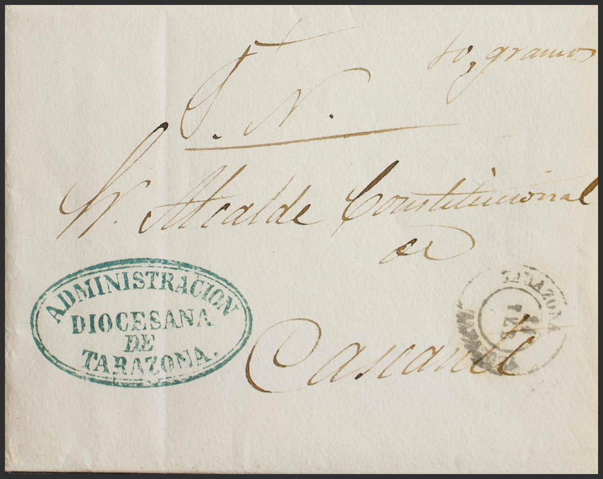 1873. TARAZONA a CASCANTE. Marca ADMINISTRACION / DIOCESANA / DE / TARAZONA, utilizada como franquicia. MAGNIFICA.
