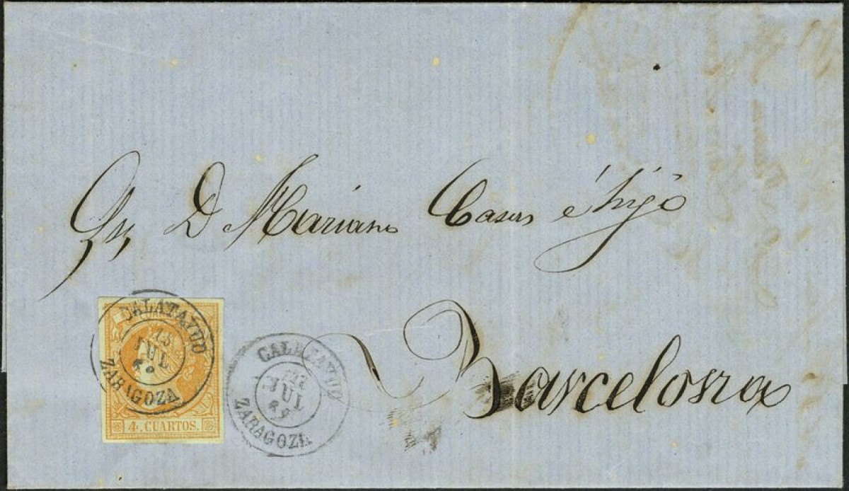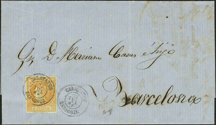 52. 1860. 4 cuartos amarilllo. CALATAYUD a BARCELONA. Matasello CALATAYUD / 15-JUL-1862 / ZARAGOZA. ULTIMO DIA DE CIRCULACION. MAGNIFICA Y RARISIMA.
