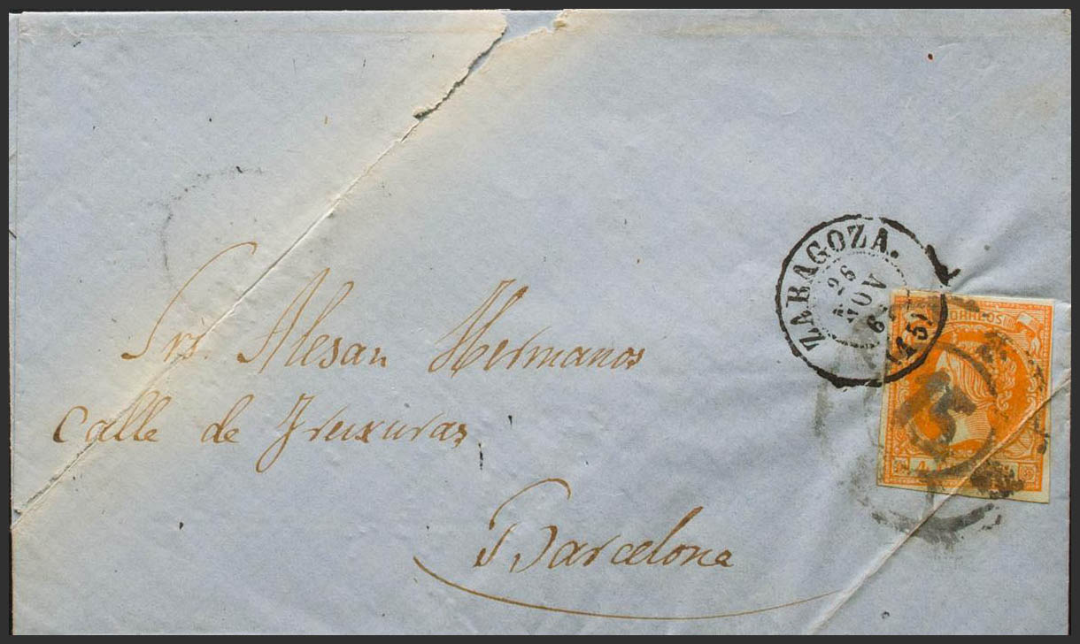 52. 1861. 4 cuartos naranja. ZARAGOZA a BARCELONA. Matasello ZARAGOZA / (15) y R.CARRETA Nº15. MAGNIFICA.