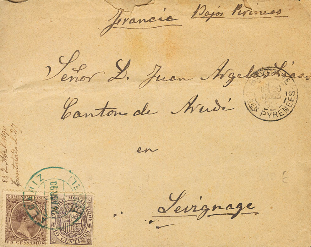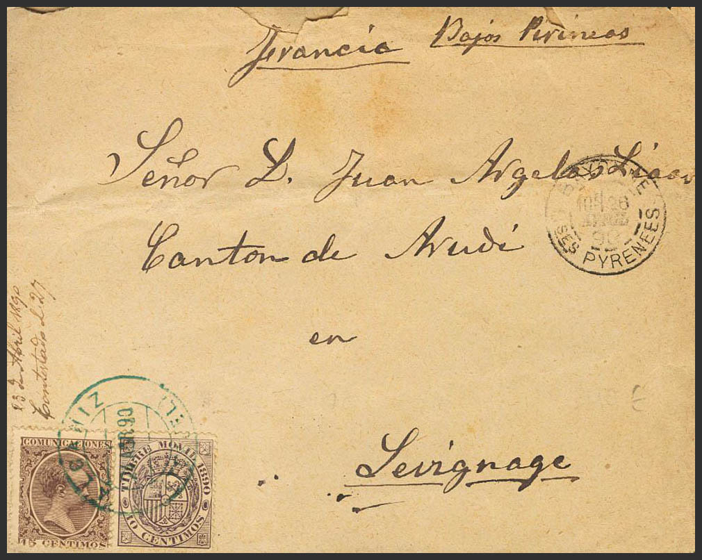 219. 1890. 15 cts castaño y Timbre Móvil de 10 cts castaño. ALCAÑIZ a ABUDY (FRANCIA). Matasello ALCAÑIZ / (TERUEL), en azul y al dorso llegada. MAGNIFICA Y MUY RARA.