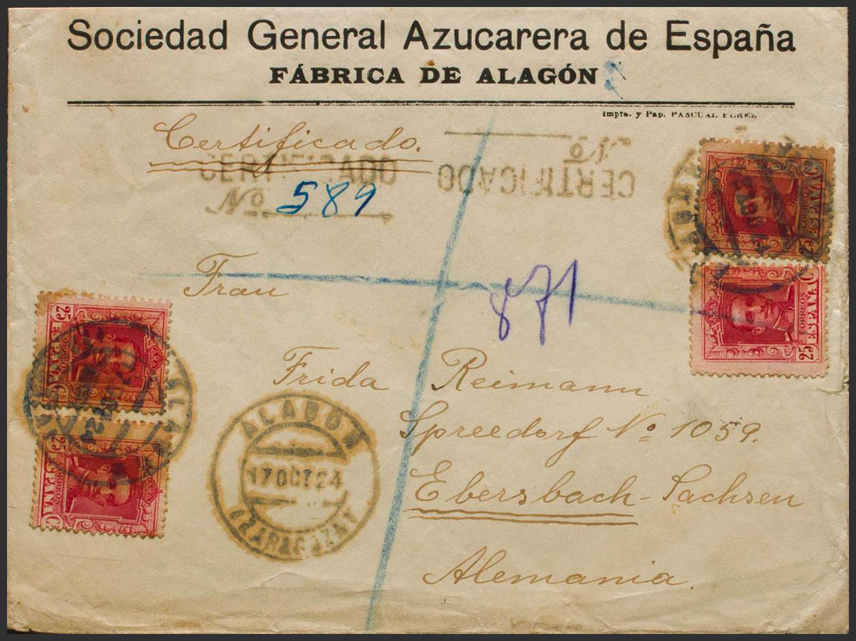 317(4). 1924. 25 cts carmÃn, cuatro sellos. Certificado de ALAGON a EBERSBACH (ALEMANIA). Matasello ALAGON / ZARAGOZA, al dorso llegada. MAGNIFICA Y RARA.