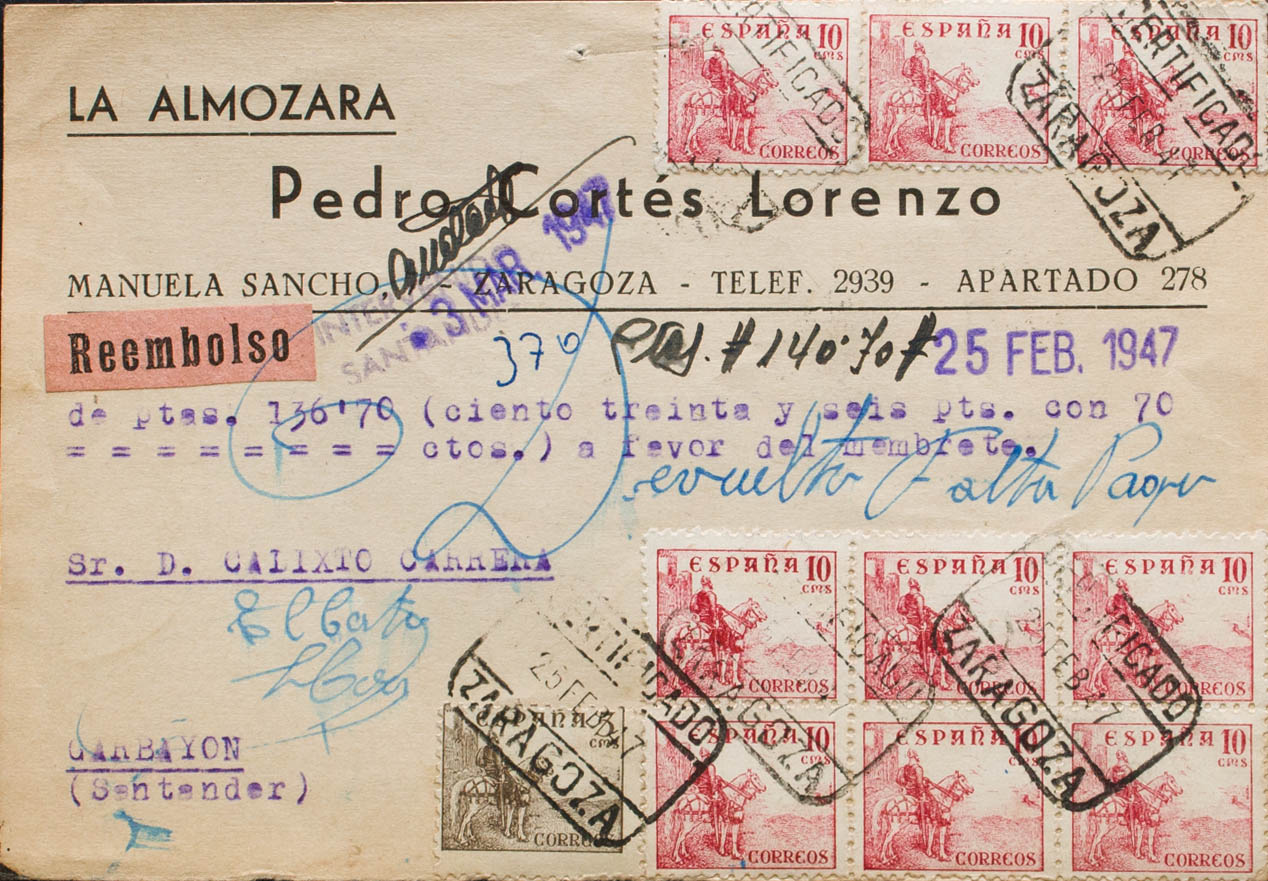917(9), 916. 1947. 10 cts, nueve sellos y 5 cts. Frente de Paquete Certificado-Reembolso de ZARAGOZA a GARBAYON (SANTANDER) y devuelto a su origen. Matasello CERTIFICADO / ZARAGOZA. MAGNIFICA.