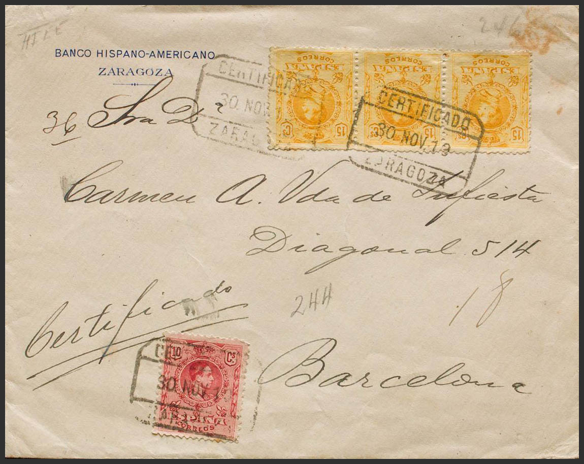 269, 271(3). 1919. 10 cts rojo y 15 cts amarillo, tira de tres. Certificado de ZARAGOZA a BARCELONA. Al dorso llegada. MAGNIFICA.