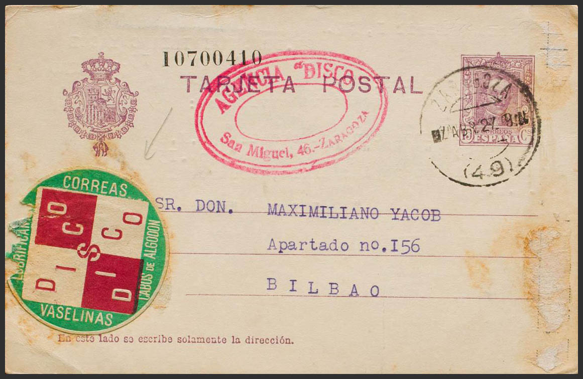 EP57. 1927. 15 cts lila sobre Tarjeta Entero Postal de ZARAGOZA a BILBAO. En el frente etiqueta comercial de la AGENCIA DISCO. MAGNIFICA Y RARA.