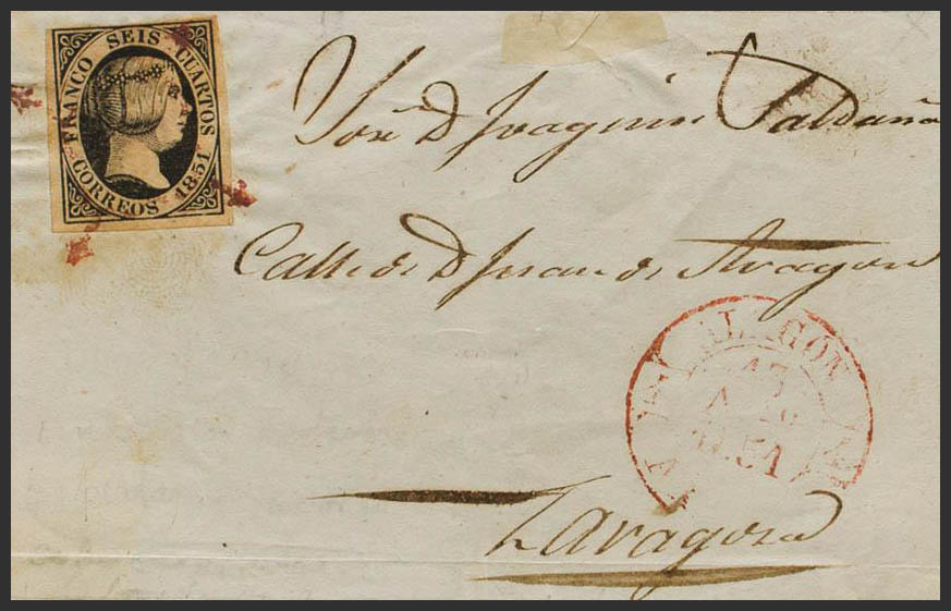 Aragón. Historia Postal. Frontal. ARAÑA, en rojo y en el frente ALAGON / ARAGON. MAGNIFICO Y RARISIMO.
