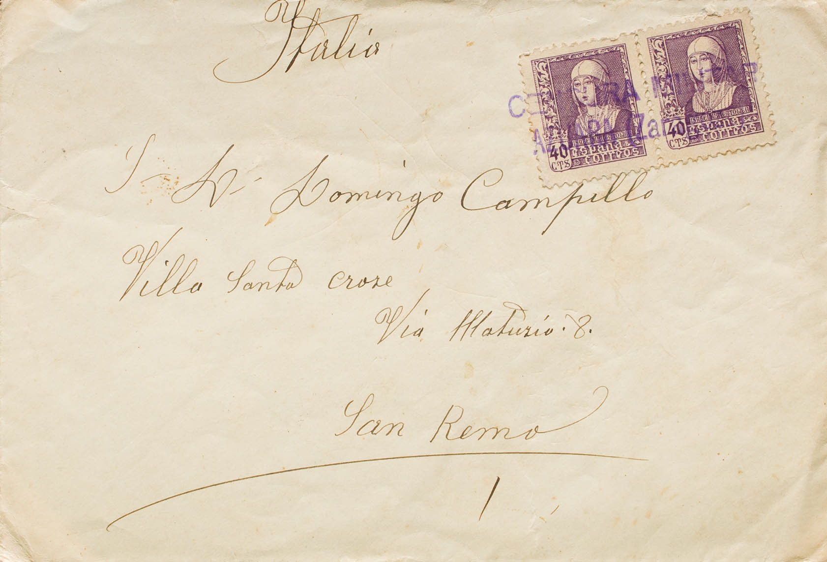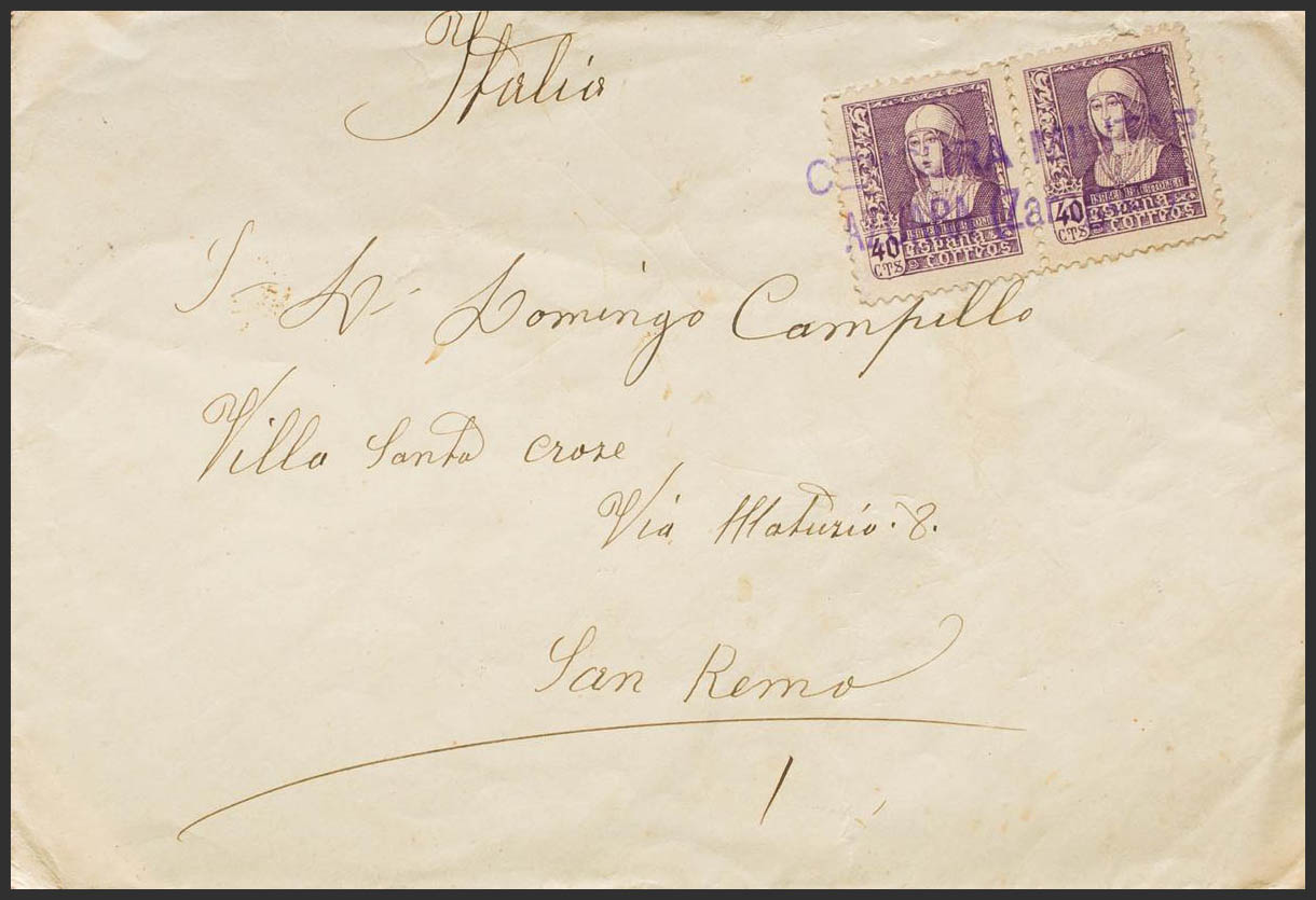 Aragón. Historia Postal. CENSURA MILITAR / AZUARA (ZARAGOZA), al dorso llegada. MAGNIFICA.