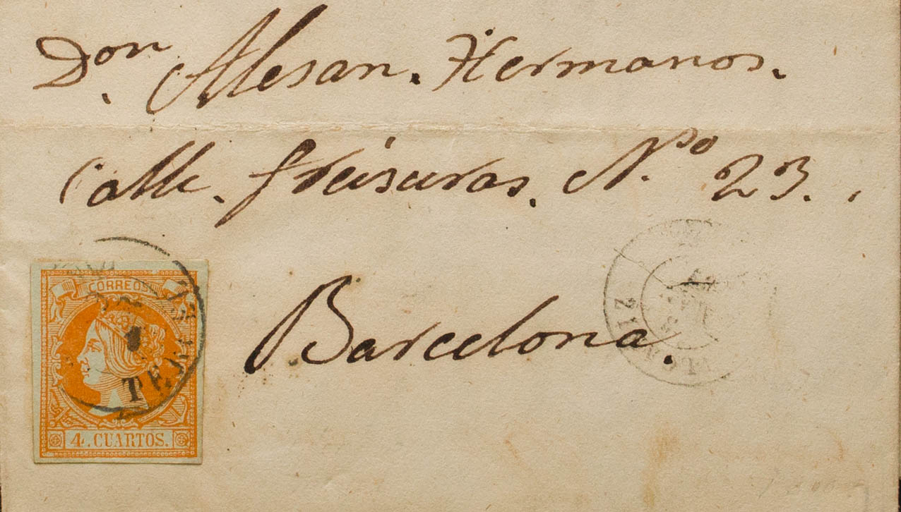 52. 1861. 4 cuartos naranja. ALCAÑIZ a BARCELONA. Matasello ALCAÑIZ / TERUEL (Tipo I) y en el frente ALCAÑIZ / TERUEL (Tipo II). MAGNIFICA.