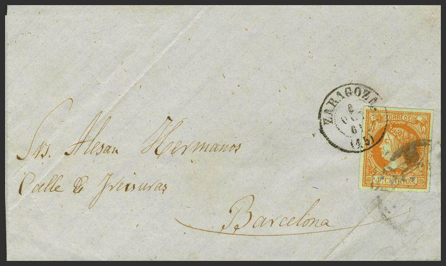52. 1861. 4 cuartos amarillo. ZARAGOZA a BARCELONA. Matasello R. CARRETA Nº 15 y ZARAGOZA (15).
