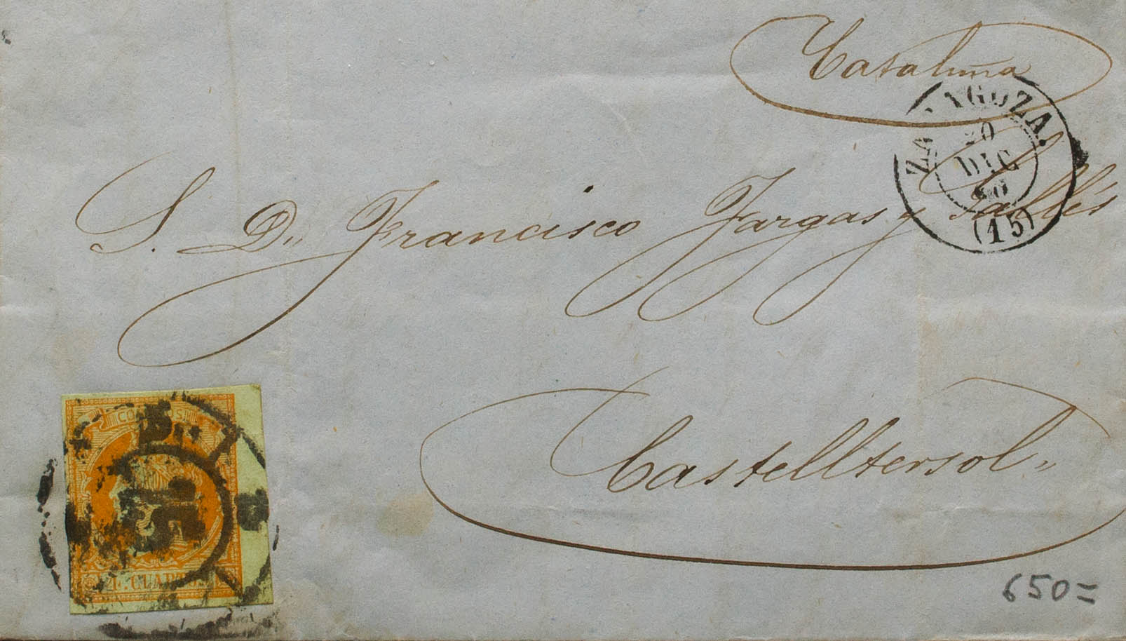 52. 1860. 4 cuartos naranja. ZARAGOZA a CASTELLTERSOL. Matasello R.CARRETA Nº15. MAGNIFICA.