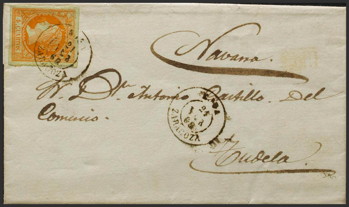 52. 1860. 4 cuartos naranja. EJEA a TUDELA. Matasello EJEA / ZARAGOZA. MAGNIFICA.