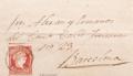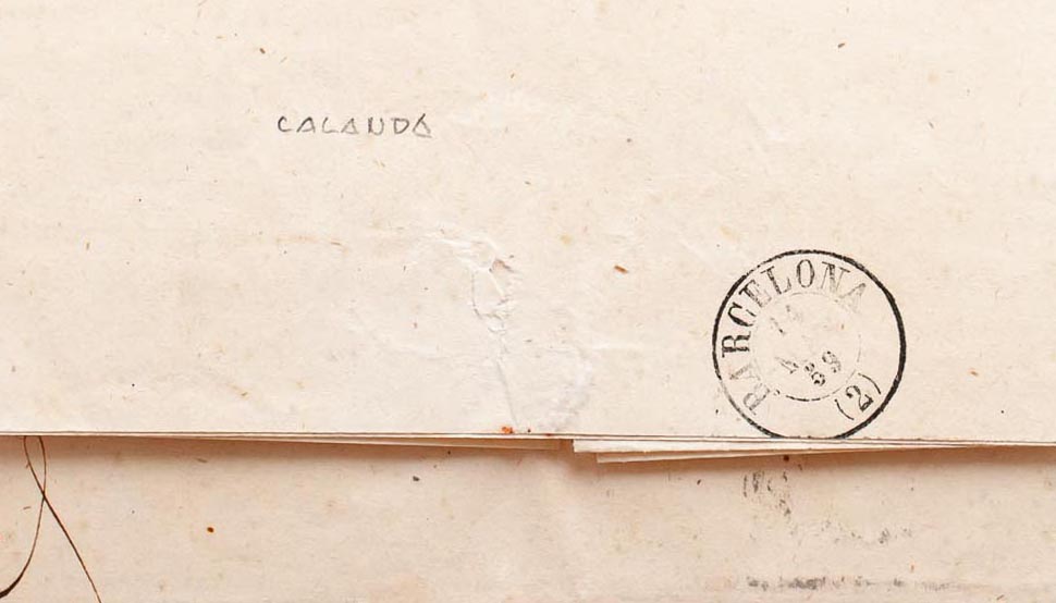 48. 1859. 4 cuartos rojo. CALANDA a BARCELONA. Matasello CALANDA / TERUEL (Tipo I). MAGNIFICA Y EXTREMADAMENTE RARA.