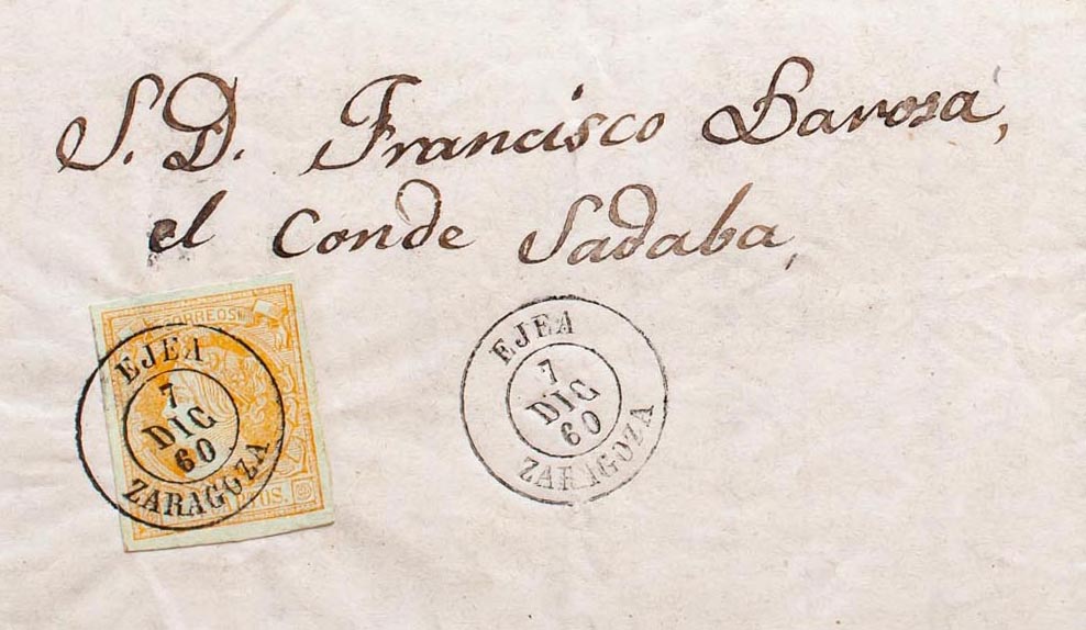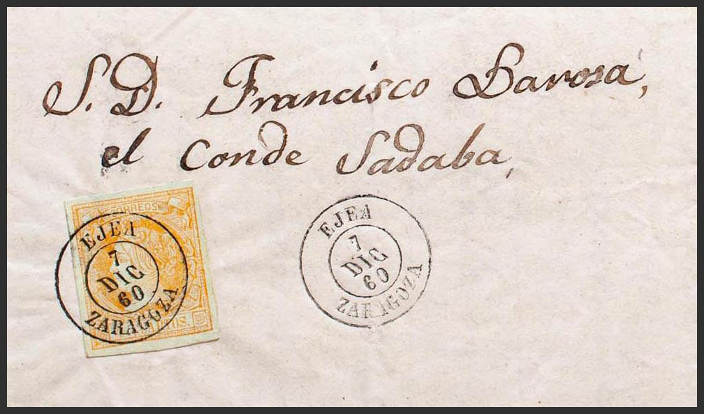 52. 1860. 4 cuartos naranja. EGEA a SADABA. Matasello EJEA / ZARAGOZA. MAGNIFICA.