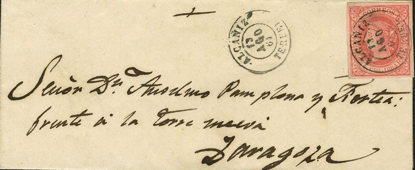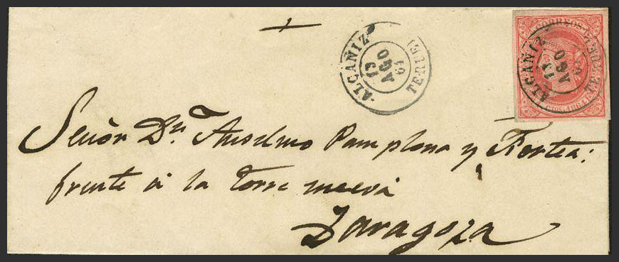 64. 1864. 4 cuartos rojo. ALCAÑIZ a ZARAGOZA. Matasello ALCAÑIZ / TERUEL. MAGNIFICA.
