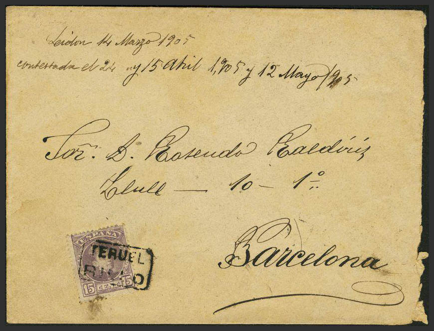 246. 1905. 15 cts violeta. RILLO a BARCELONA. Matasello de carterÃa TERUEL / RILLO. MAGNIFICA.