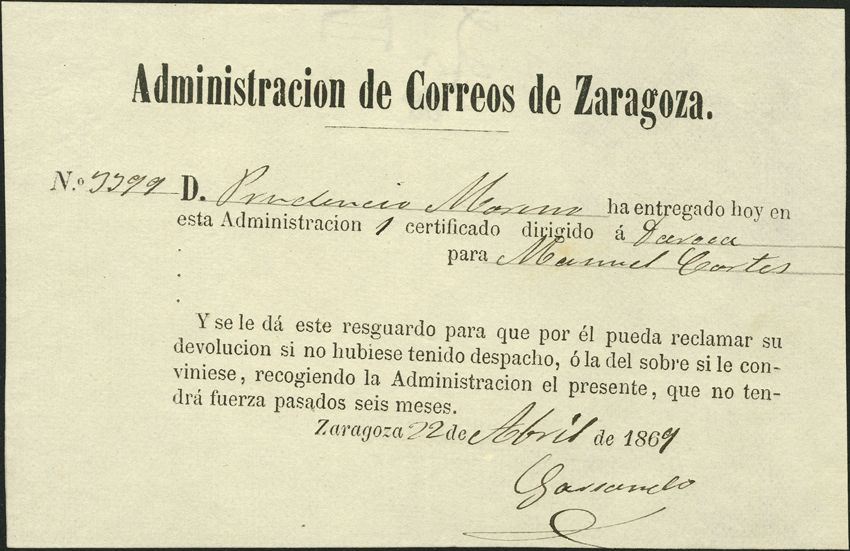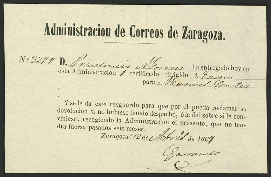 Aragón. Historia Postal. Resguardo de certificado.