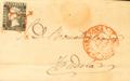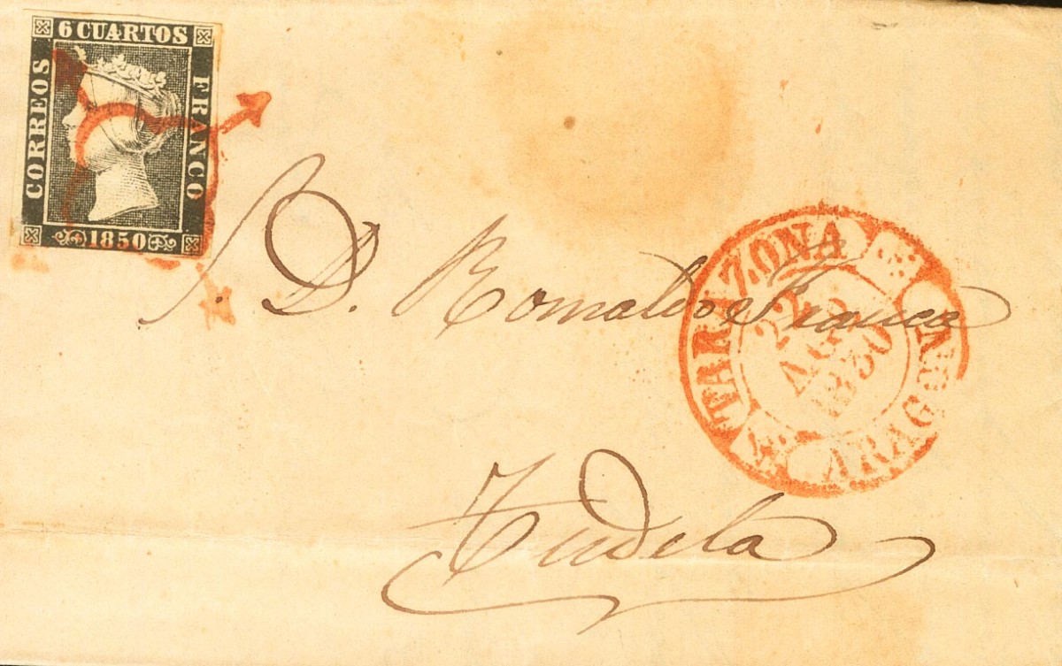 1A. 1850. 6 cuartos negro. TARAZONA a TUDELA. Matasello ARAÑA ROJA, al lado baeza TARAZONA / ZARAGOZA. MAGNIFICA Y MUY RARA EN ESTA CALIDAD.