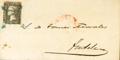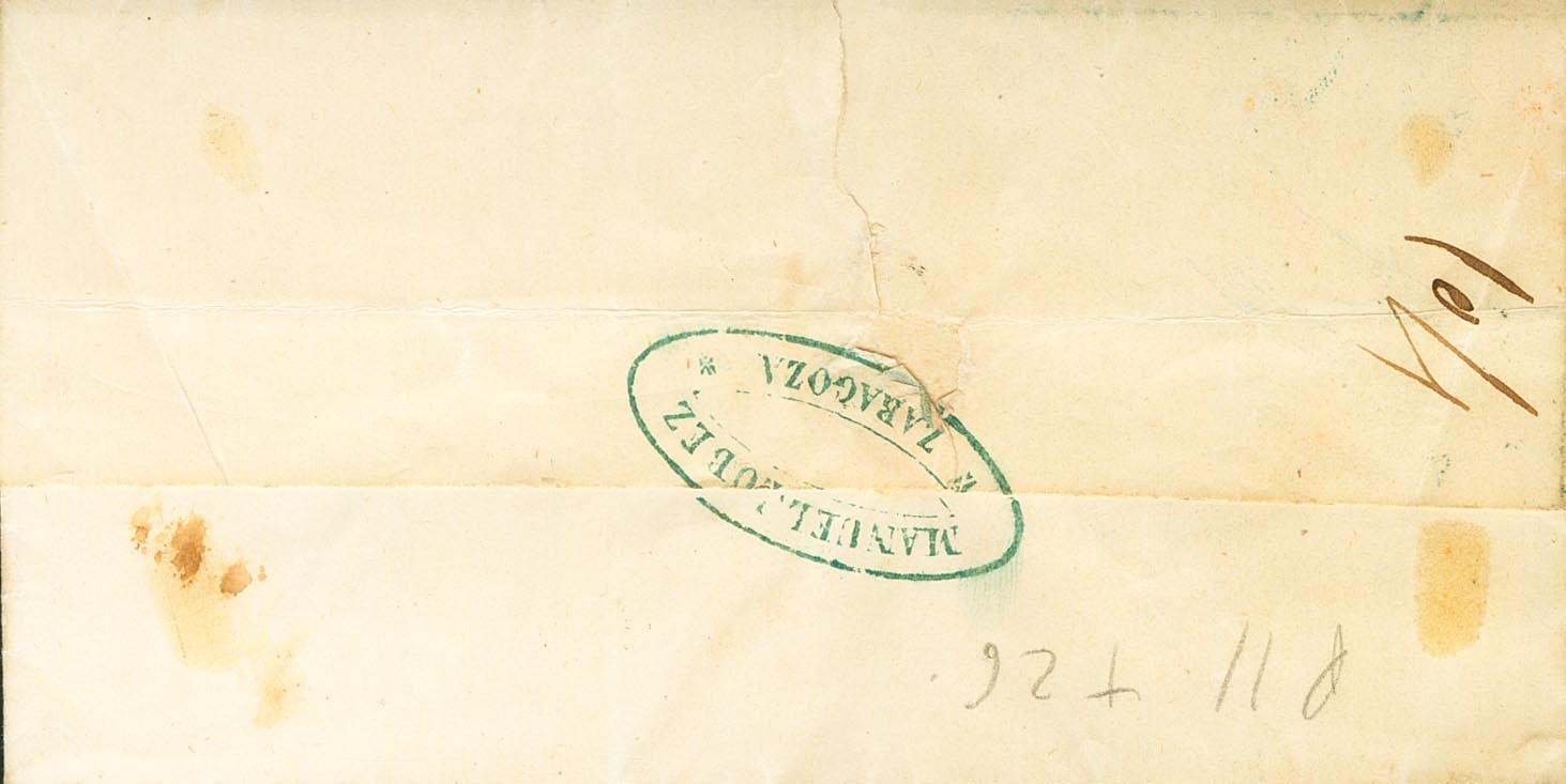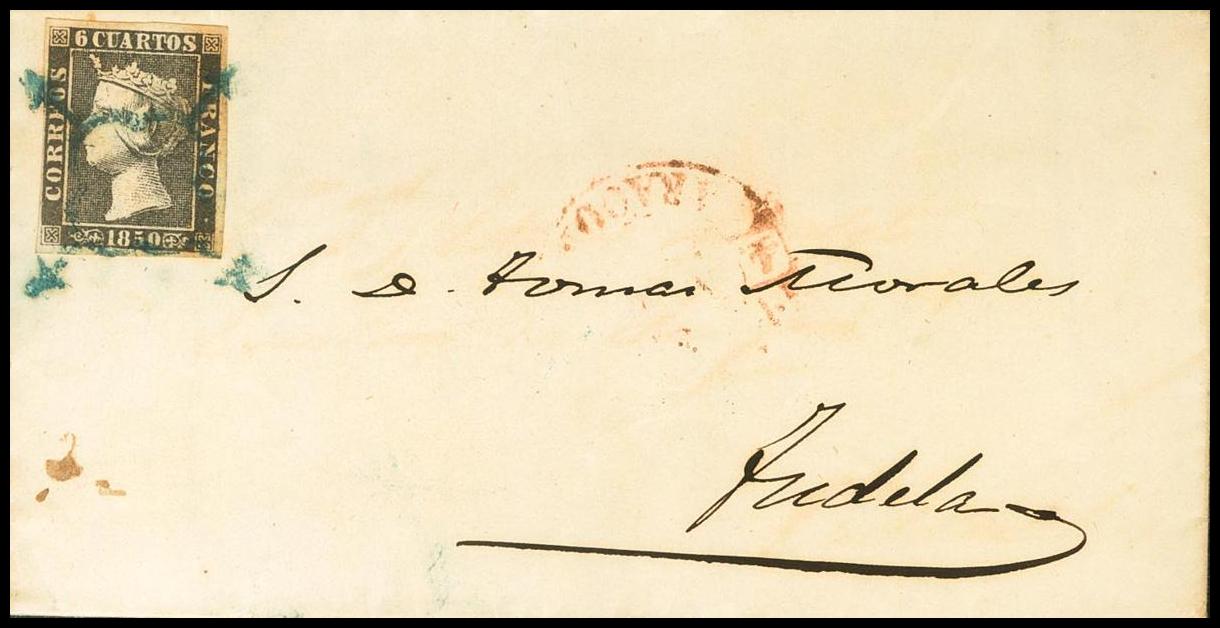 1A. 1850. 6 cuartos negro. ZARAGOZA a TUDELA. Matasello ARAÑA, en azul. MAGNIFICA Y ESPECTACULAR.