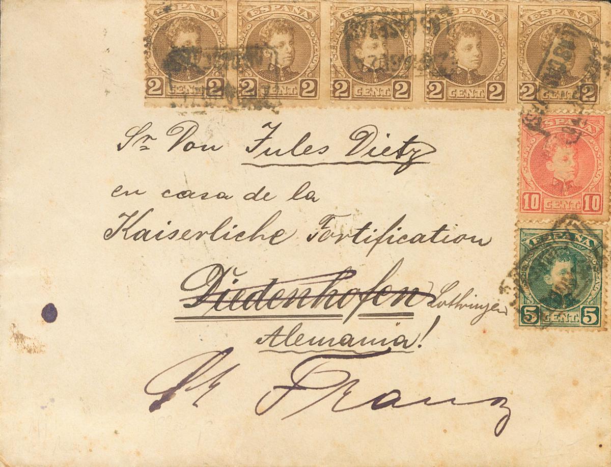 241(5), 242, 243. 1902. 2 cts castaño, cinco sellos, 5 cts verde y 10 cts rojo. LAS CASETAS (ZARAGOZA) a DIEDENHOFEN (ALEMANIA), reexpedida a ST.FRANZ. Matasello cartería ZARAGOZA / LAS CASETAS, al dorso llegadas. MAGNIFICA Y RARA, PIEZA DE ENORME ESPECTACULARIDAD.