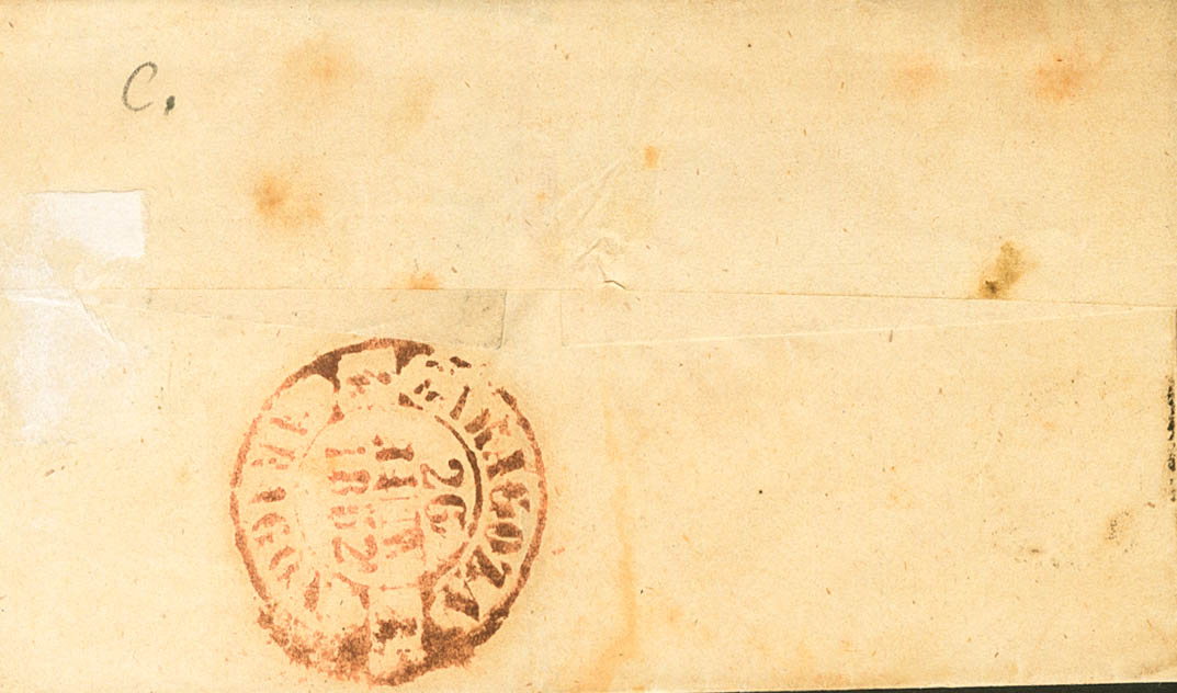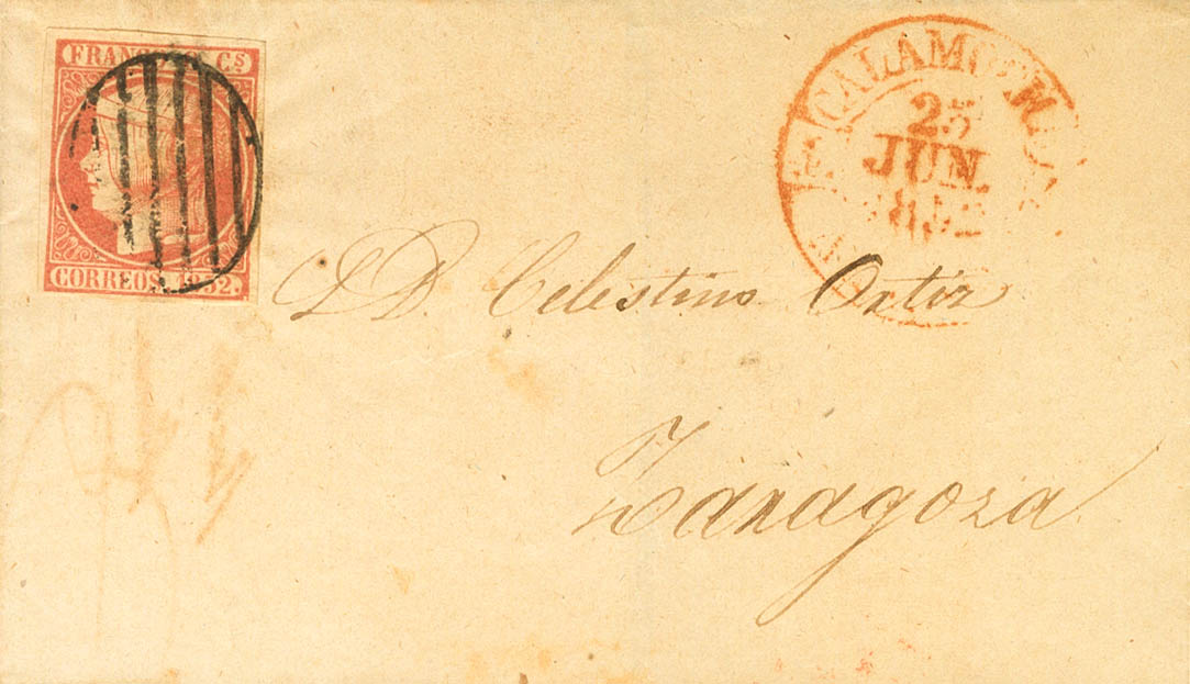 12. 1852. 6 cuartos rosa. CALAMOCHA a ZARAGOZA. En el frente baeza CALAMOCHA / ARAGON, en rojo. MAGNIFICA.
