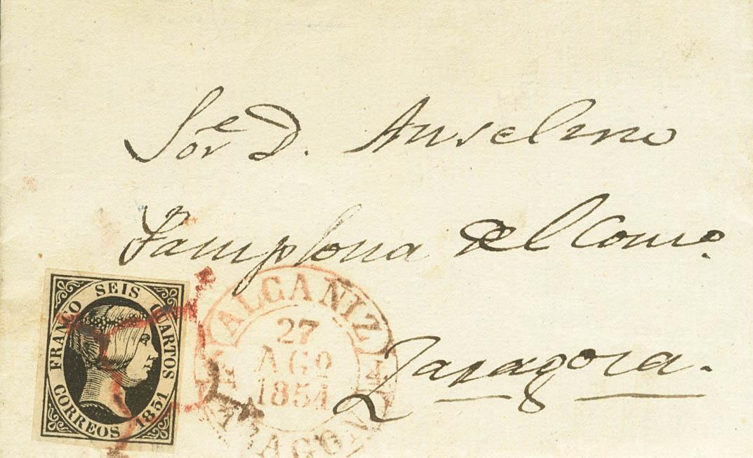 6. 1851. 6 cuartos negro. ALCAÑIZ (TERUEL) a ZARAGOZA. Matasello ARAÑA, en rojo. MAGNIFICA Y MUY RARA, PIEZA DE ESPECTACULAR BELLEZA.