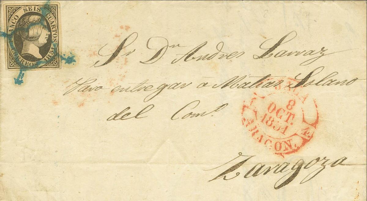 6. 1851. 6 cuartos negro. BERDUN (HUESCA) a ZARAGOZA. Matasello ARAÑA, en azul. MAGNIFICA Y MUY RARA, PIEZA DE ESPECTACULAR BELLEZA.