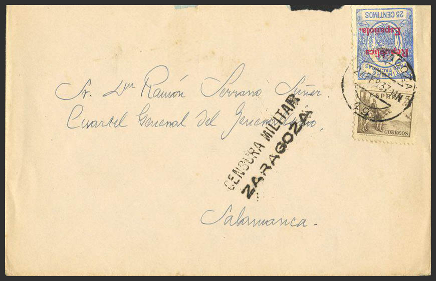 Fis 13. 1937. 25 cts azul FACTURAS. ZARAGOZA a SALAMANCA. Al dorso llegada. MAGNIFICO Y ESPECTACULAR FRANQUEO.