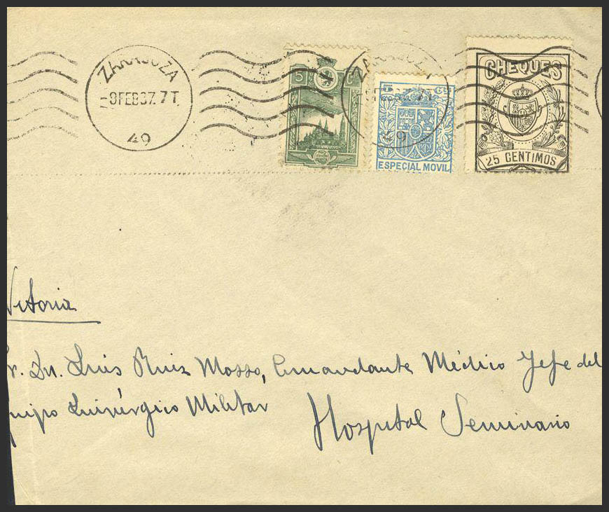 Fis 28, 17. 1937. 5 cts azul MOVIL, 25 cts negro CHEQUES. ZARAGOZA a VITORIA. Al dorso llegada. MAGNIFICA.