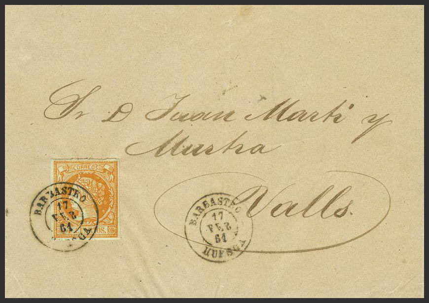52. 1861. 4 cuartos amarillo. BARBASTRO a VALLS. Matasello BARBASTRO / HUESCA. MAGNIFICA.