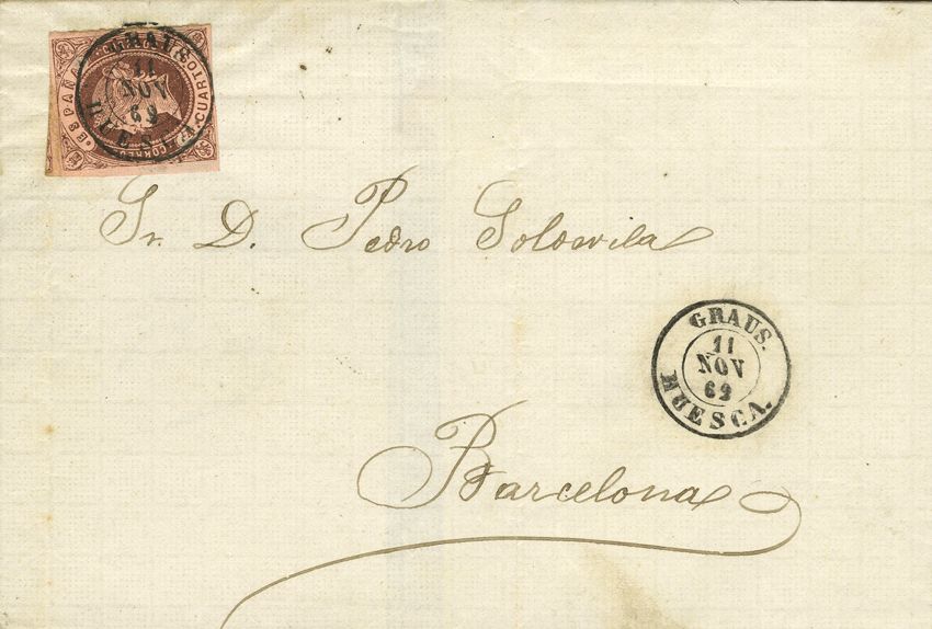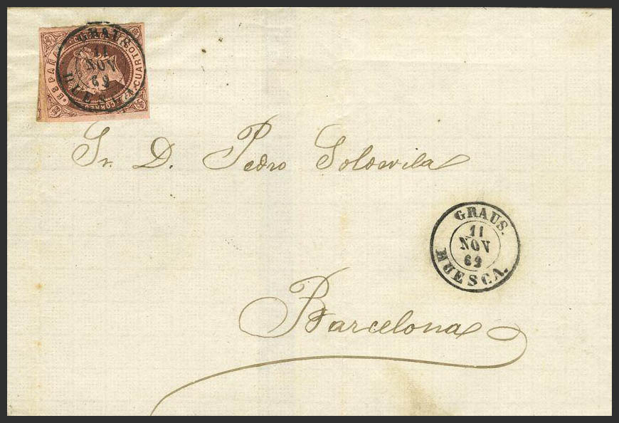 58. 1862. 4 cuartos castaño. GRAUS a BARCELONA. Matasello GRAUS / HUESCA. MAGNIFICA Y RARA.