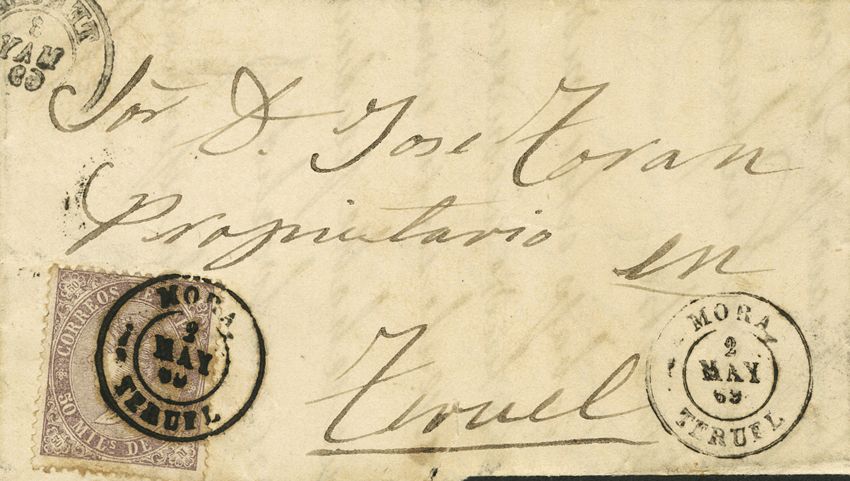 98. 1869. 50 mils violeta. MORA a TERUEL. Matasello MORA / ARAGON. MAGNIFICA.