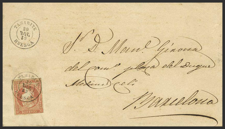 48. 1859. 4 cuartos rojo. TAMARITE a BARCELONA. Matasello TAMARITE / HUESCA. MAGNIFICA Y RARA.