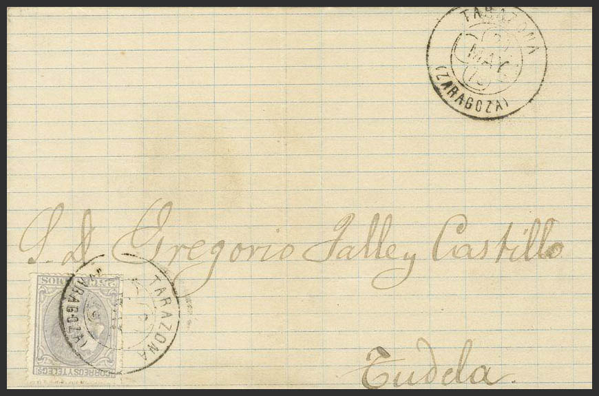 204. 1879. 25 cts gris. TARAZONA a TUDELA. Matasello trébol TARAZONA / (ZARAGOZA). MAGNIFICA.
