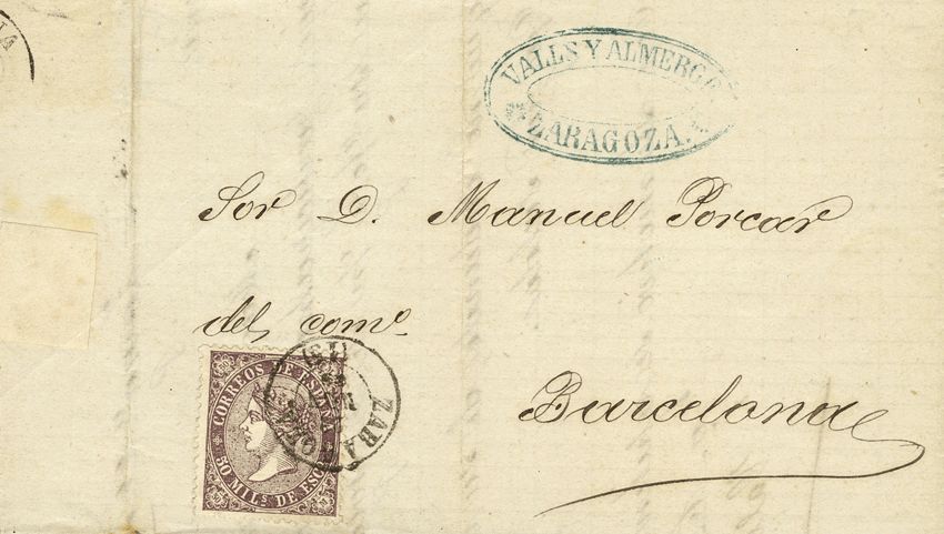 98. 1869. 50 mils violeta. ZARAGOZA a BARCELONA. Matasello ZARAGOZA / (15). MAGNIFICA.