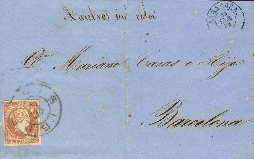 Aragón. Historia Postal. R. CARRETA Nº15, de Zaragoza y "MUESTRAS SIN VALOR". MAGNIFICA.