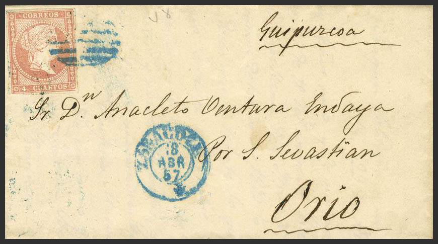 Aragón. Historia Postal. PARRILLA, en azul y en el frente ZARAGOZA / * (Tipo I). MAGNIFICA.