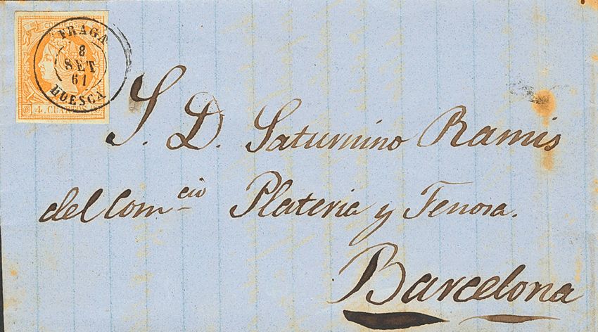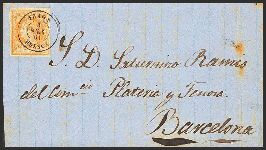 52. 1861. 4 cuartos amarillo. FRAGA a BARCELONA. Matasello FRAGA / HUESCA. MAGNIFICA.