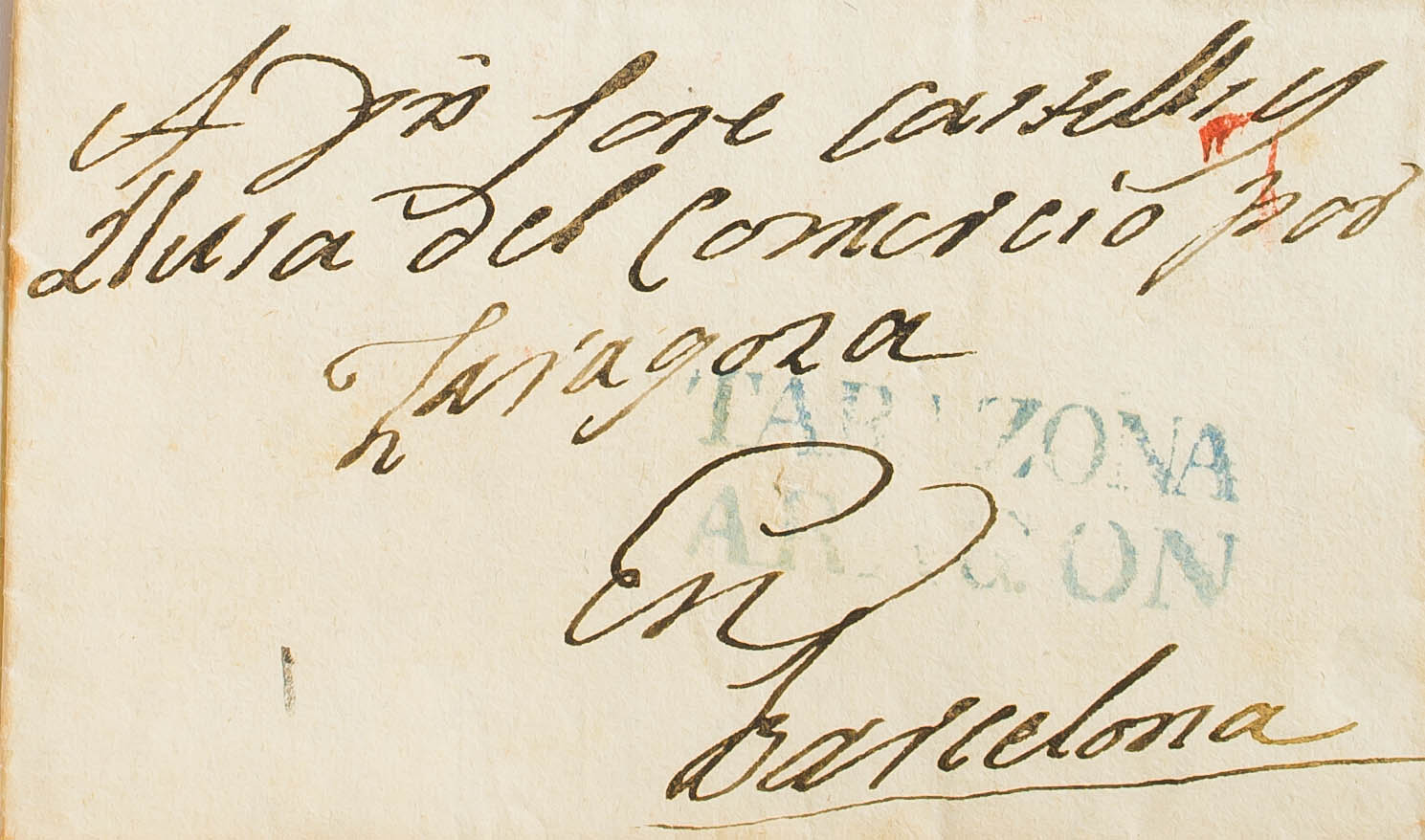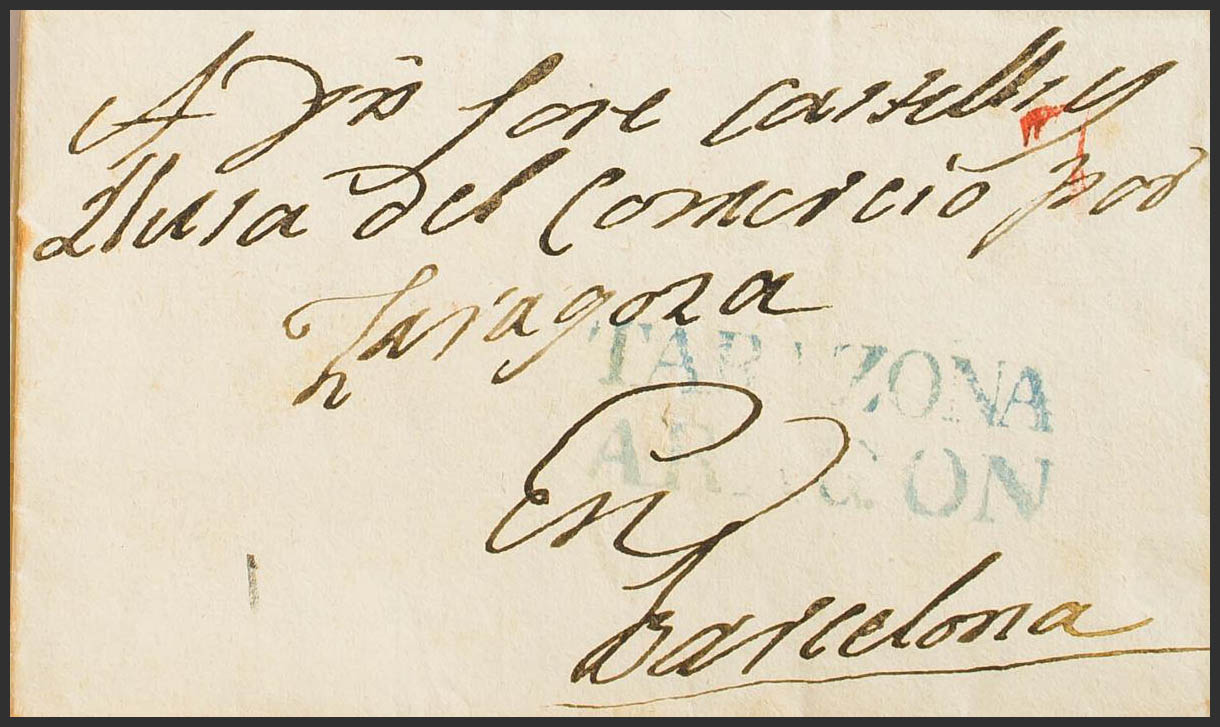 1842. TARAZONA a BARCELONA. Marca TARAZONA / ARAGON, en azul (P.E.4) edición 2004. MAGNIFICA.