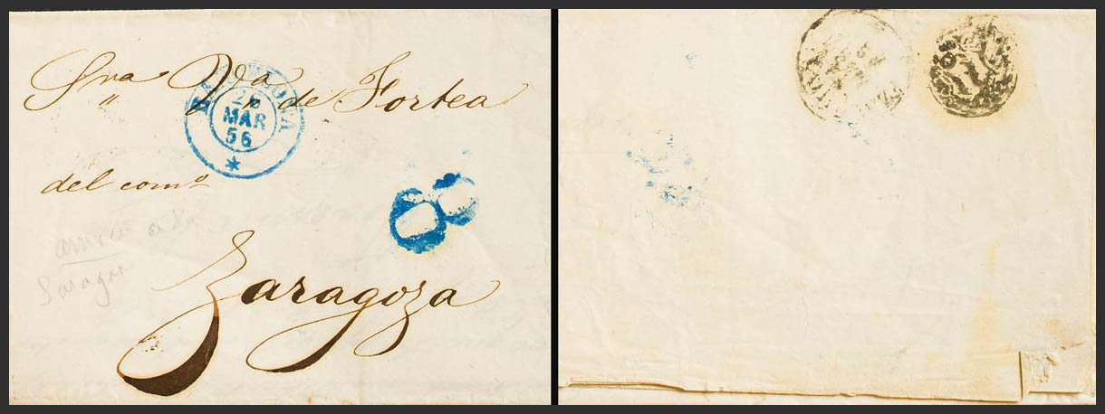 1856. BARCELONA a ZARAGOZA. Marca "Z", en negro de llegada al dorso (P.E.45) edición 2004. MAGNIFICA.