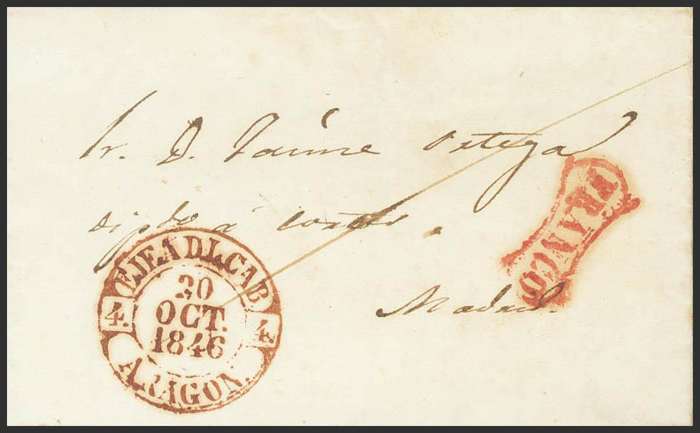1846. EGEA DE LOS CABALLEROS a MADRID (dirigida al diputado Jaime Ortega). Baeza EJEA D.L. CAB. / ARAGON y marca FRANCO, de uso general a su llegada a Madrid. MAGNIFICA Y MUY RARA.