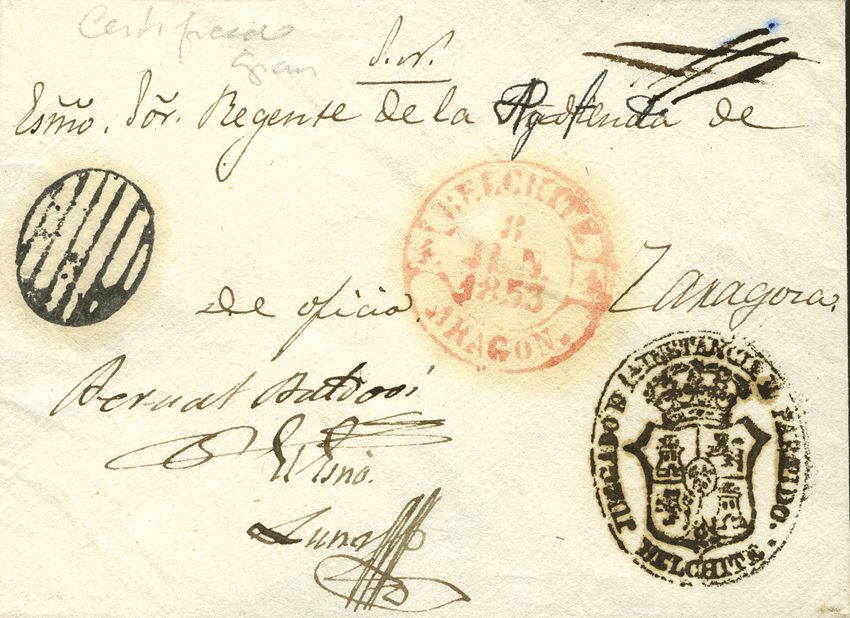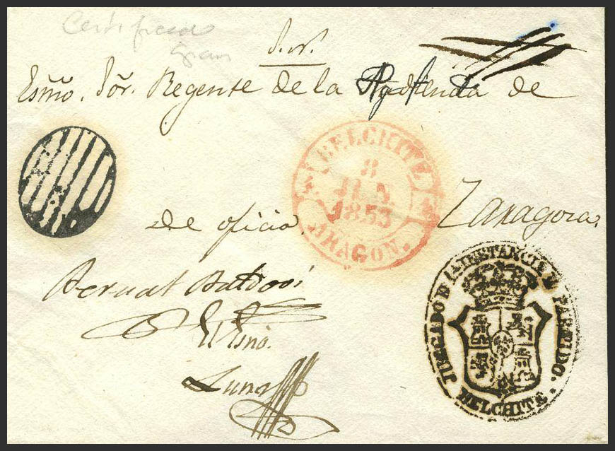 1853. BELCHITE a ZARAGOZA. Marca PARRILLA, indicando que la carta circulaba franca, en el frente baeza BELCHITE / ARAGON y marca JUZGADO DE 1ª INSTANCIA DEL PARTIDO / BELCHITE. MAGNIFICA Y RARISIMA. Cert. GRAUS.