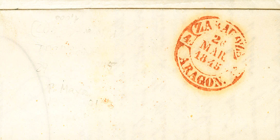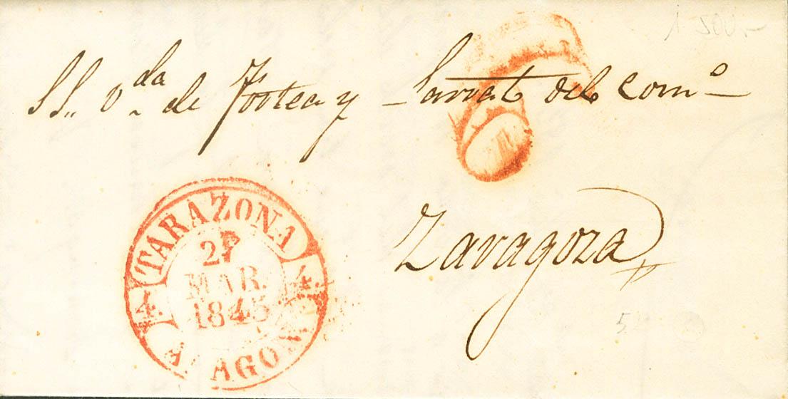 1845. TARAZONA (ZARAGOZA) a ZARAGOZA. Baeza TARAZONA / ARAGON, en rojo. MAGNIFICA.