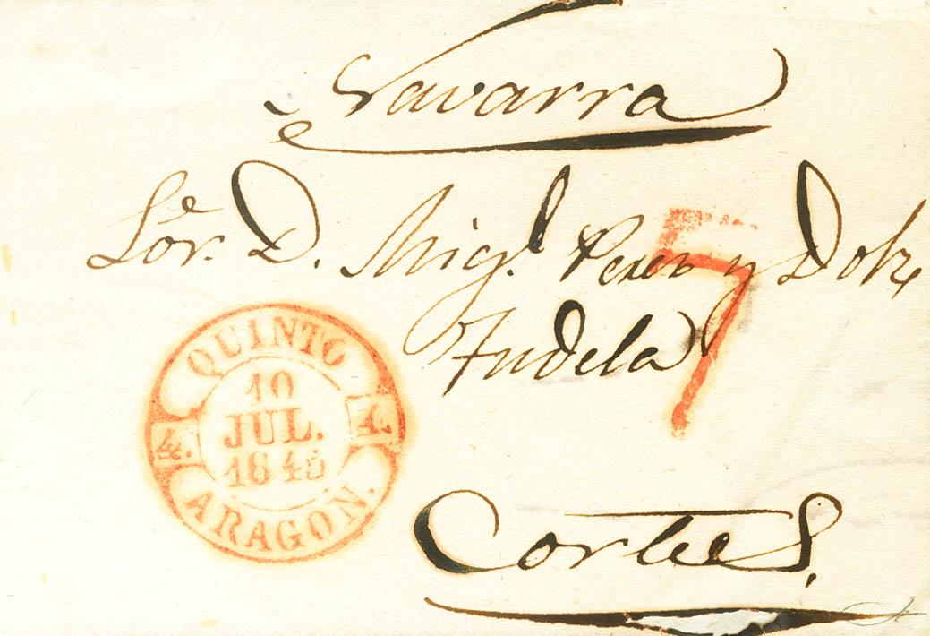 1845. QUINTO (ZARAGOZA) a CORTES (NAVARRA). Baeza QUINTO / ARAGON, en rojo. MAGNIFICA ESTAMPACION.