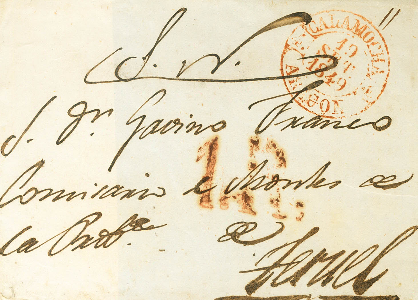 1849. Frontal de CALAMOCHA (TERUEL) a TERUEL. Baeza CALAMOCHA / ARAGON, en rojo. MAGNIFICA.