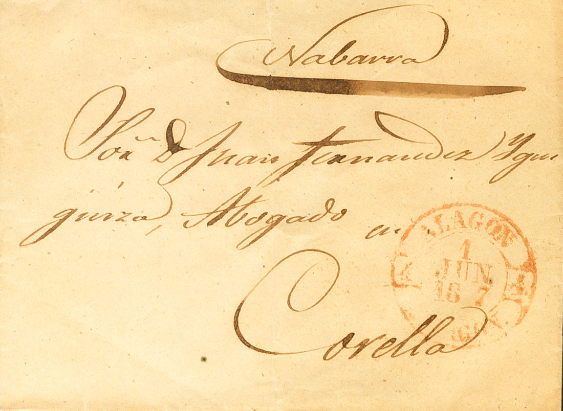 1847. ALAGON (ZARAGOZA) a CORELLA. Baeza ALAGON / ARAGON, en rojo. MAGNIFICA Y RARA.