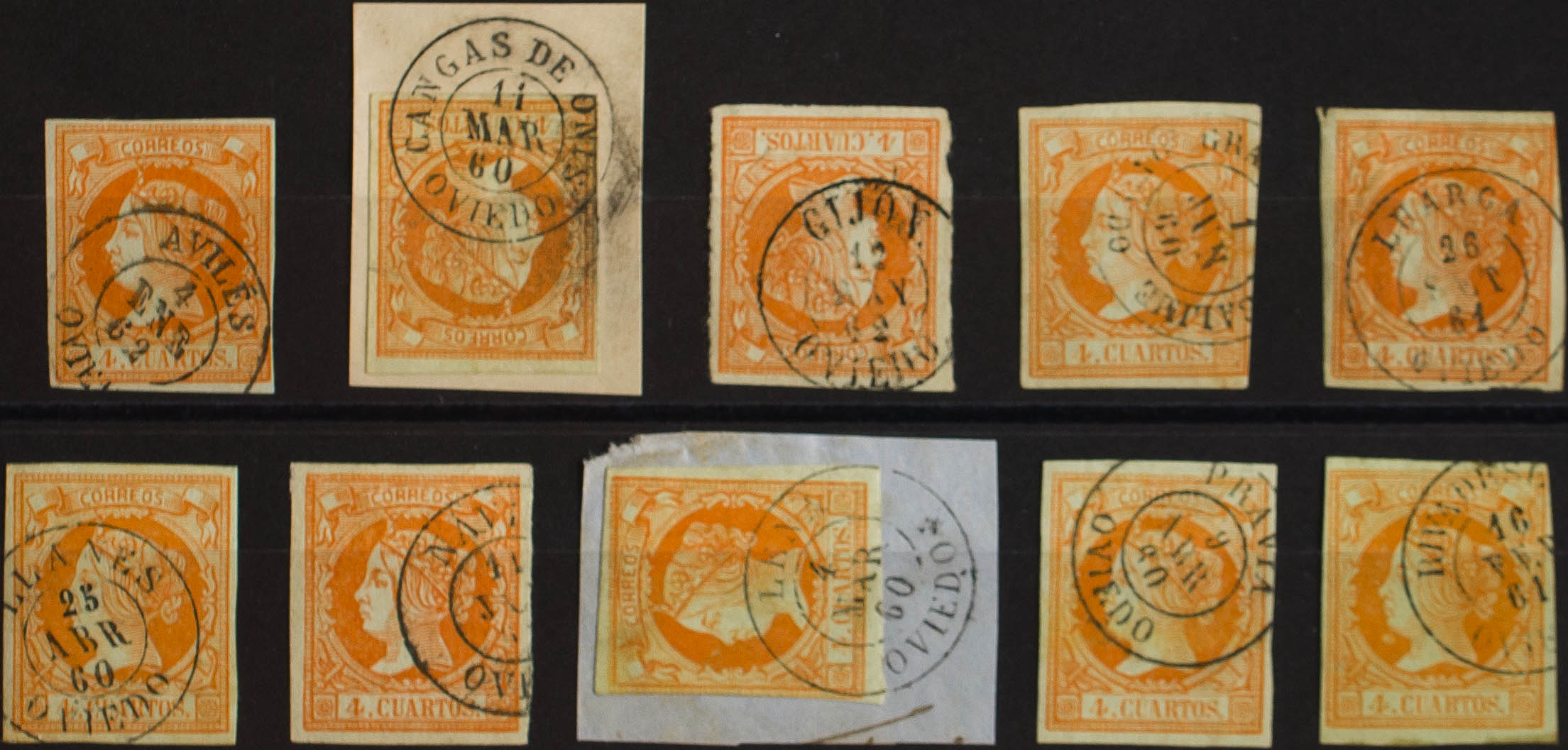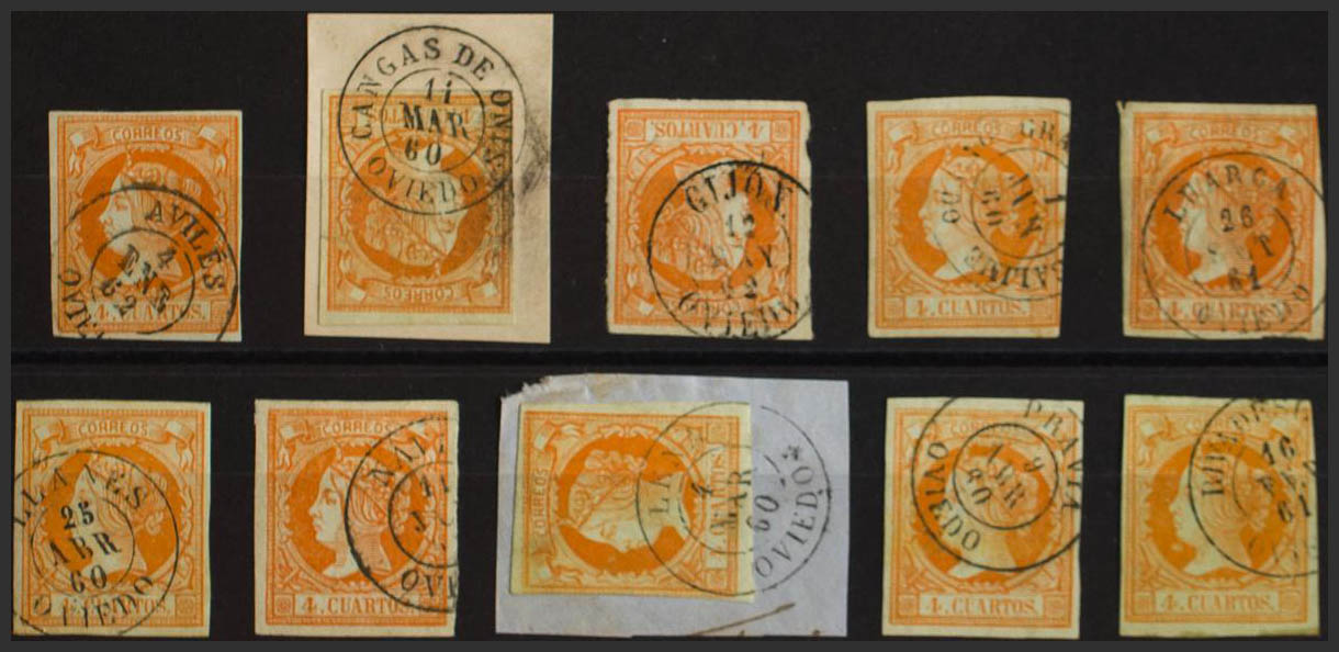 52(10). 1860. Conjunto de diez sellos del 4 cuartos amarillo inutilizados con los fechadores de la provincia de Oviedo: AVILES, CANGAS DE ONIS, GIJON, GRANDE DE SALIMAS, LUARCA, LLANES, NAVIA, LENA, PRAVIA y RIBADESELLA. MAGNIFICO.