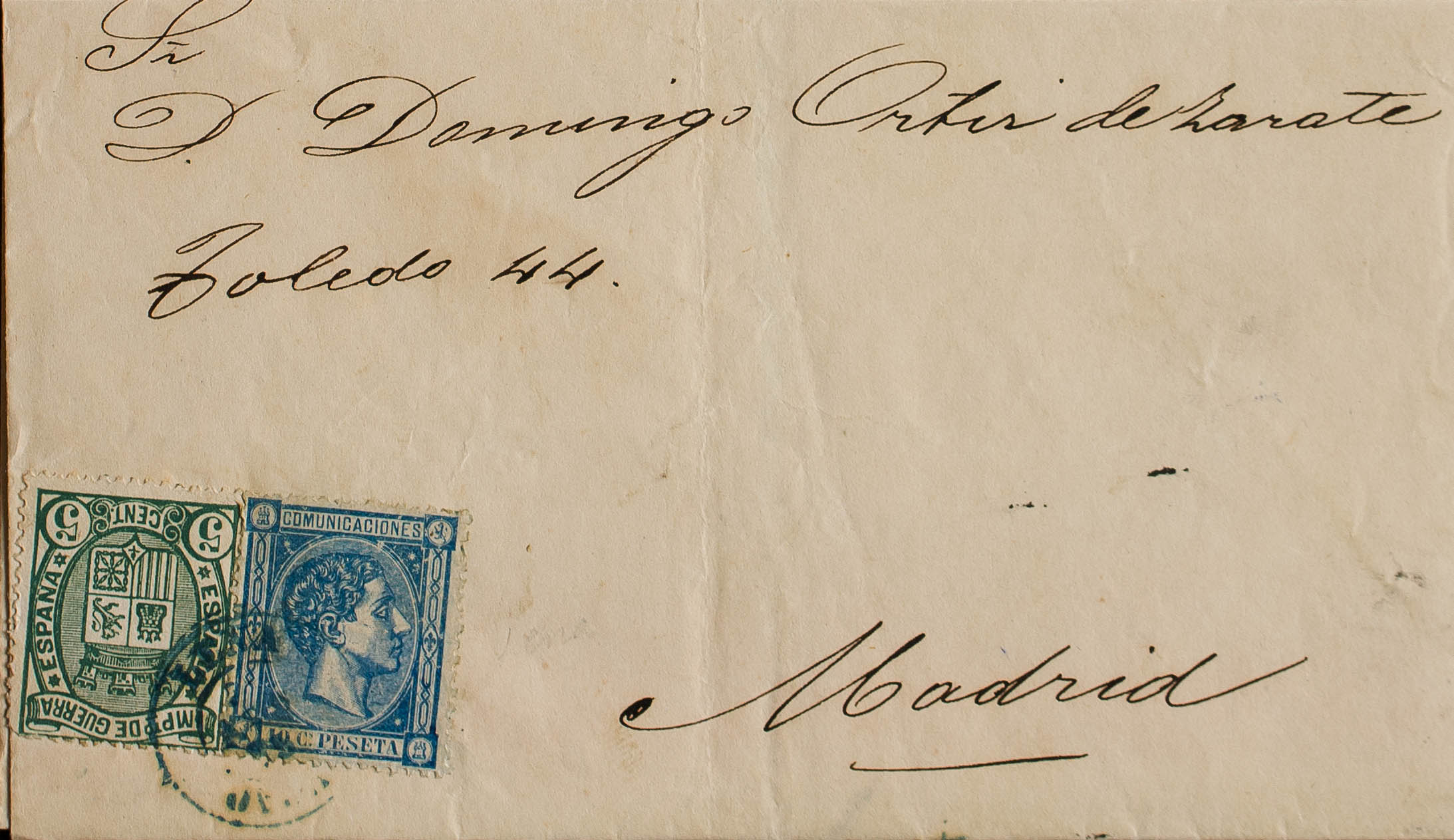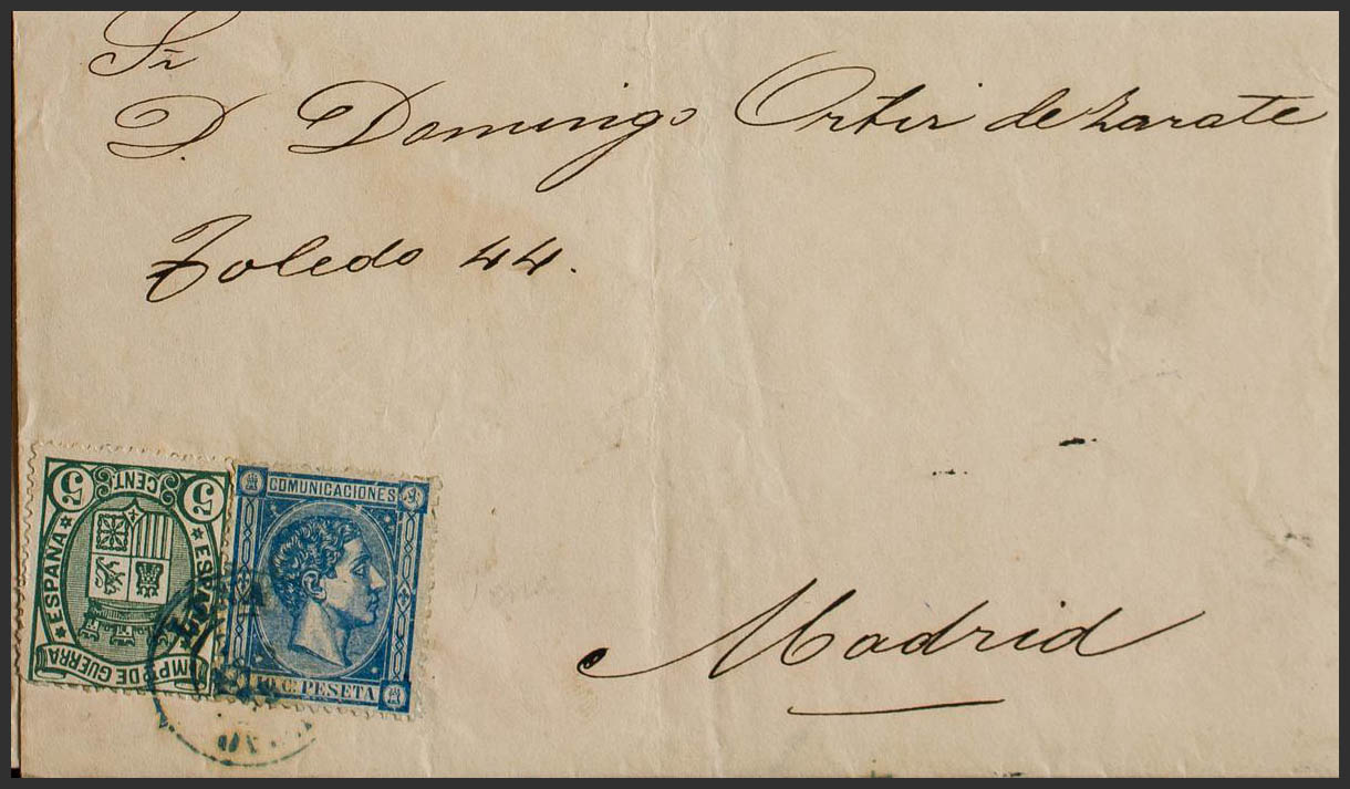 164, 154. 1876. 10 cts azul y 5 cts verde. POLA DE LENA a MADRID. Matasello LENA / OVIEDO, en azul. MAGNIFICA Y RARA.
