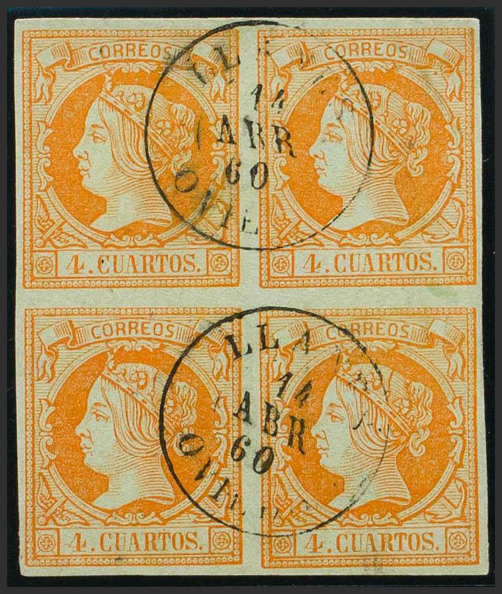 52(4). 1860. 4 cuartos naranja, bloque de cuatro. Matasello LLANES / OVIEDO. MAGNIFICO.