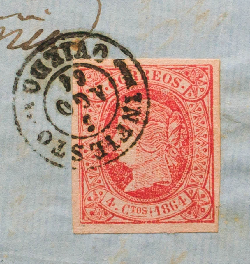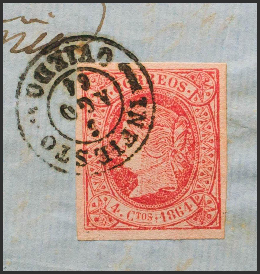 △ 64. 1864. 4 cuartos rojo, sobre fragmento. Matasello INFIESTO / OVIEDO. MAGNIFICO.